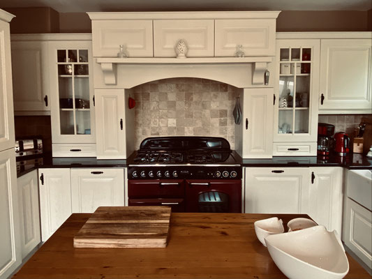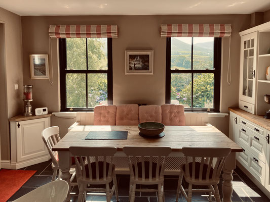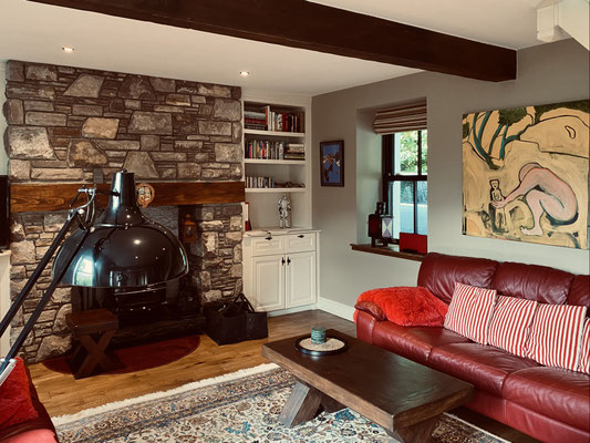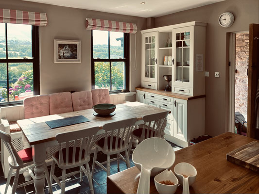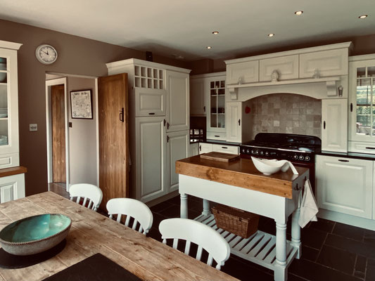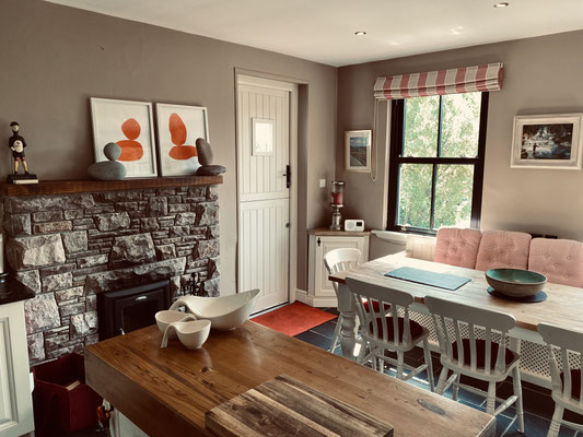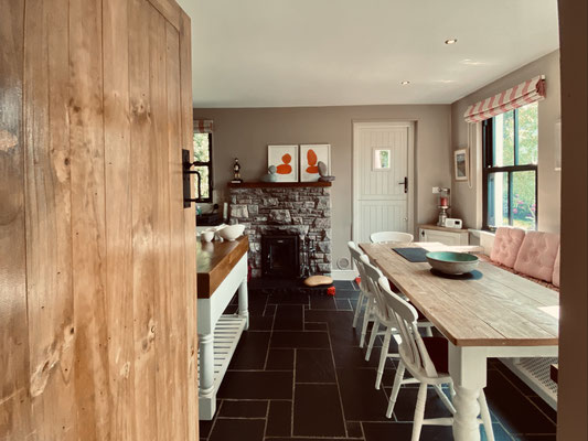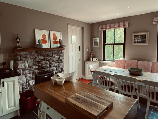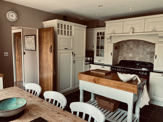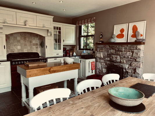 The country style kitchen is the heart of Railway Cottage and provides all modern features like AGA cooker, dishwasher, fridge, freezer, microwave, toaster, water kettle and coffee machine. There is also a fireplace in the kitchen. A stable door leads to the bbq area and the garden with two herb areas.