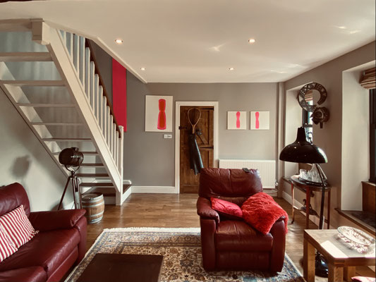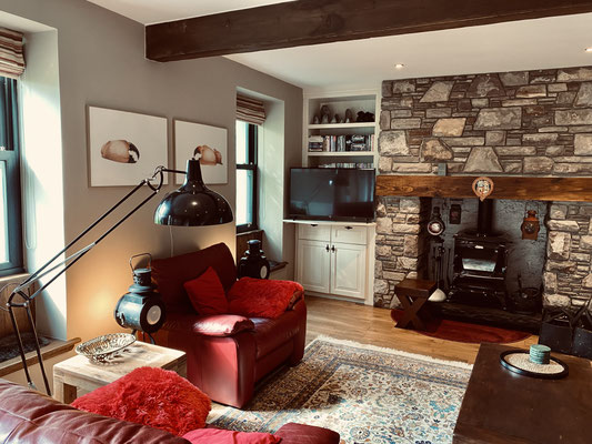 The living room is the former base of the milesmens house. For your entertainment we provide traditional board games, as well as a selection of books and guidebooks, cds, dvds and blue rays. And, of course, a 4k smart TV and a XBoxOneS. To create a cozy cottage atmosphere you will find a fireplace surrounded with original lamps and lights from old railway lines. Also there is our authentic and steep staircase to the first floor.